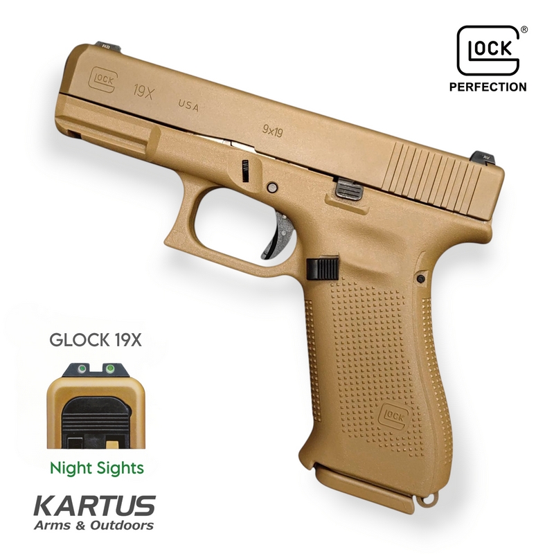 The Glock 19X is a crossover pistol combining the best features of the Glock 17 and Glock 19. Made in the USA, this 9mm firearm boasts a full-size frame and compact slide, enhanced with a coyote color nPVD slide finish and a lanyard loop. It is designed for maximum efficiency and reliability in both tactical and everyday use