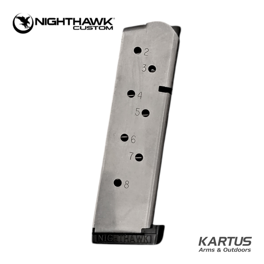 The NightHawk Custom 1911 8-round magazine is crafted from stainless steel for durability. Designed for .45 ACP, it ensures reliable feeding and is a perfect match for your 1911 pistol.