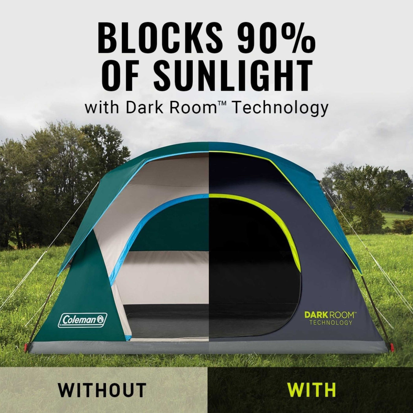 The Coleman 4-Person Dark Room™ Skydome™ Camping Tent is designed for campers who value both comfort and light control. Featuring Dark Room™ technology, it blocks 90% of sunlight so you can sleep in past sunrise and stay cooler throughout the day. Its dome structure offers easy setup and a roomy interior that comfortably fits a queen-size air bed.
