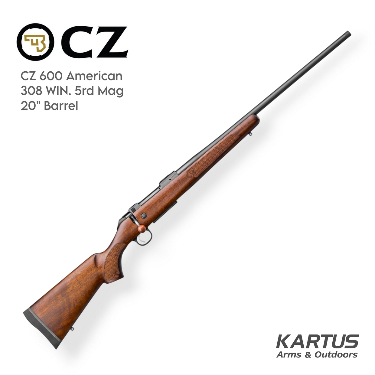 The CZ 600 AMERICAN is a modern, American-style bolt-action centerfire rifle that’s equipped with a beautifully crafted Turkish walnut stock with a fleur-de-lis on the grip. Available in a wide range of calibers, from 223 Rem. to 300 Win. Mag., it is ready to meet the needs of a wide range of hunters and sport shooters.