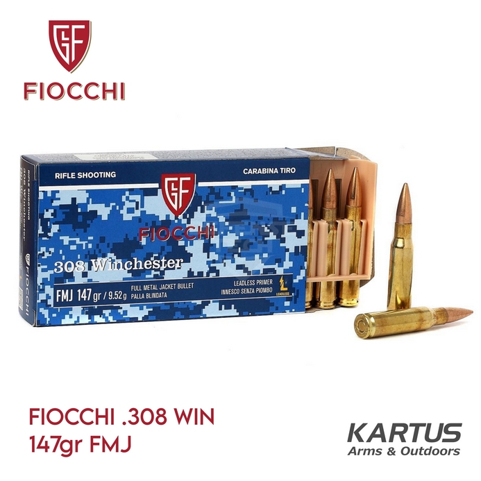 FIOCCHI .308 Winchester 147gr Full Metal Jacket, Leadless Primer. Made in Italy