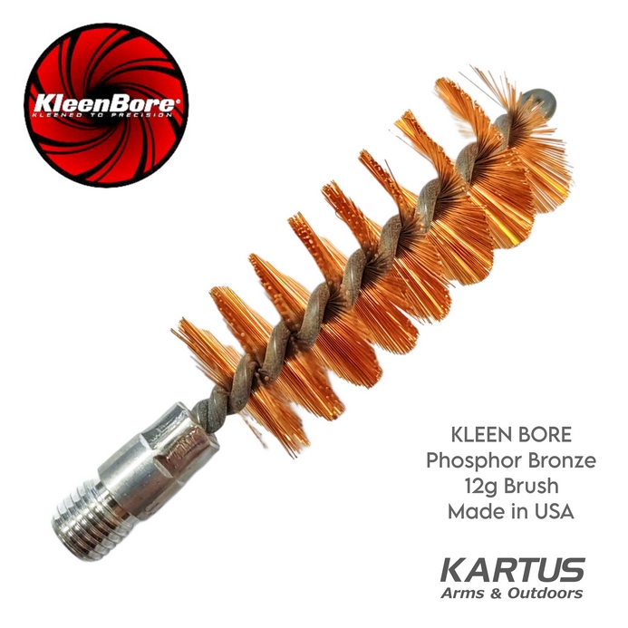 KleenBore Phosphor bronze brushes for 12 Gauge Shotguns are precision made for safe, effective removal of fouling and powder residue. Features straight (rather than crimped) wire bristles for more effective cleaning power. The brush remains thick and stout and will not easily bend with force down the bore. The bronze brush is designed specially to not damage the grooved rifling.