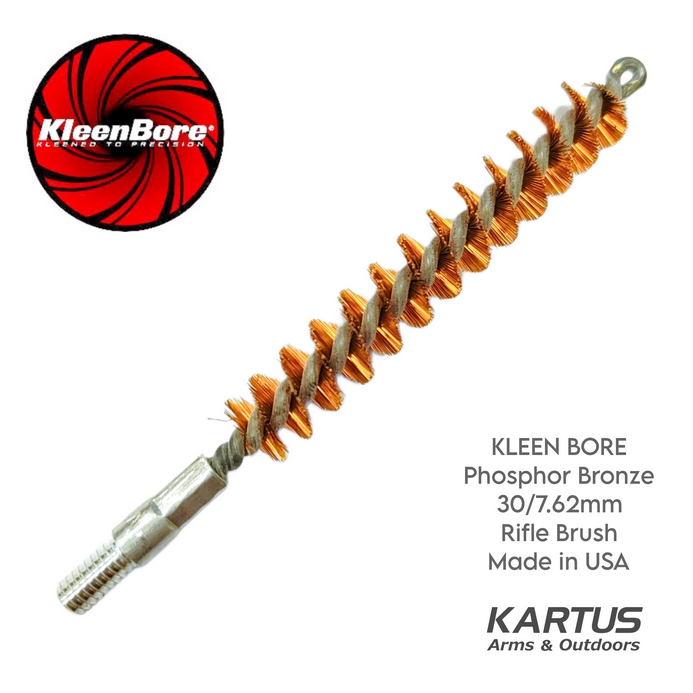 KleenBore 30/ 7.62/ .300 BLK/ .308 Cal. Rilfe Phosphor bronze brushes are precision made for safe, effective removal of fouling and powder residue. Features straight (rather than crimped) wire bristles for more effective cleaning power. The brush remains thick and stout and will not easily bend with force down the bore. The bronze brush is designed specially to not damage the grooved rifling.