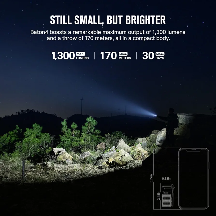 The Baton 4 is a compact EDC flashlight with high output, magnetic tailcap, and wireless charging compatibility. Ideal for urban carry.