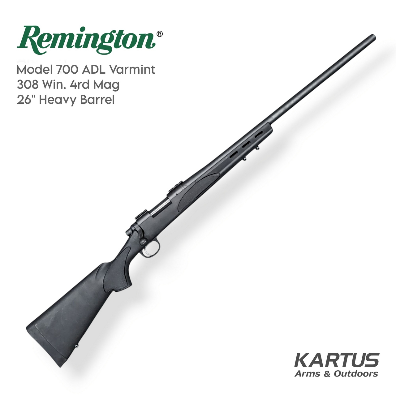 The Remington 700 ADL Varmint .308 Winchester with 26" Heavy Barrel is a legendary bolt-action rifle renowned for its accuracy and reliability. Available in various calibers, it is a top choice for hunting and precision shooting, trusted by marksmen around the world.
