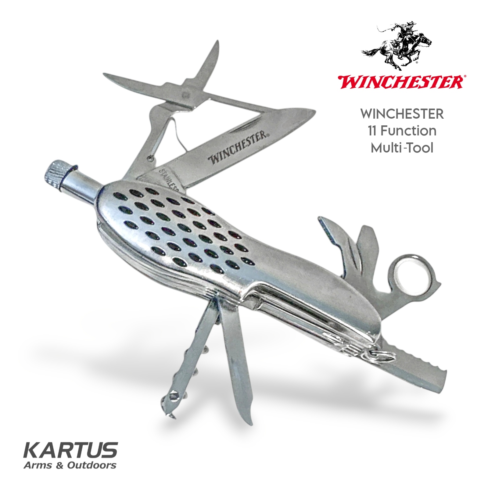 Be prepared for outdoor adventures with the Winchester Multi-Tool. This versatile tool offers 11 functions, including a knife, saw, and more, making it an essential companion for camping and hiking.